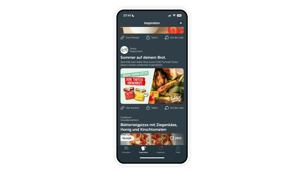 Zur Steigerung der Aufmerksamkeit für die Sommersorten Senf-Dill und Rote Linsen Chili nutzte Tartex den Sponsored Post im Inspiration-Tab von Bring!. Dieses Format adressiert Shopper:innen während der Suche nach Inspiration für den nächsten Einkauf. Ein direkter Linkout im Beitrag ermöglichte dabei den nahtlosen Übergang zur Markenseite, auf der weiterführende Details zu den Produkten bereitgestellt wurden.