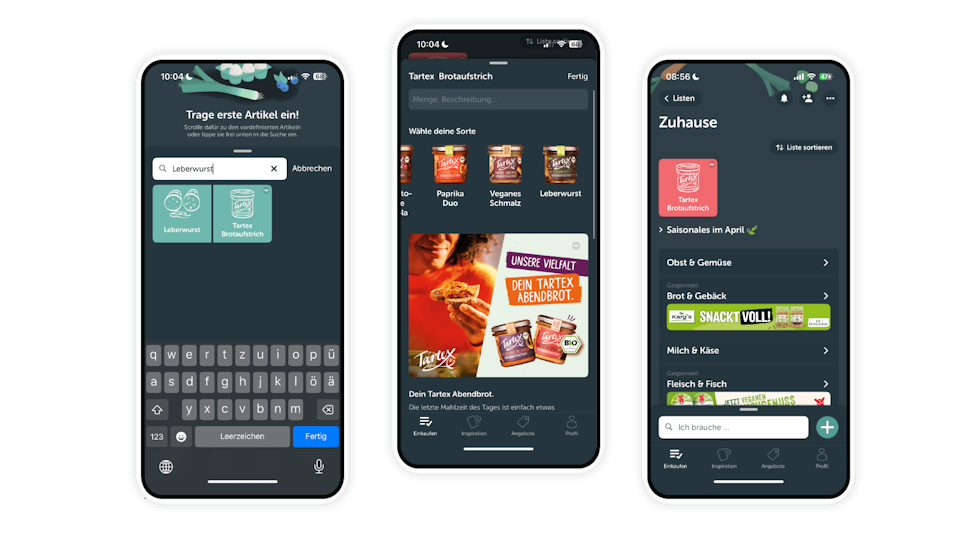 Suchten Nutzer:innen in der App nach Begriffen wie Aufstrich, Brot oder Leberwurst, wurde der Tartex Brotaufstrich als hervorgehobene Kachel prominent platziert. Ein Klick auf das Produkt führte zur Detailansicht, in der die gewünschte Sorte ausgewählt und direkt auf die Einkaufsliste gesetzt werden konnte. So wurde das Produkt unmittelbar im Moment der Kaufentscheidung für die Planung verfügbar.